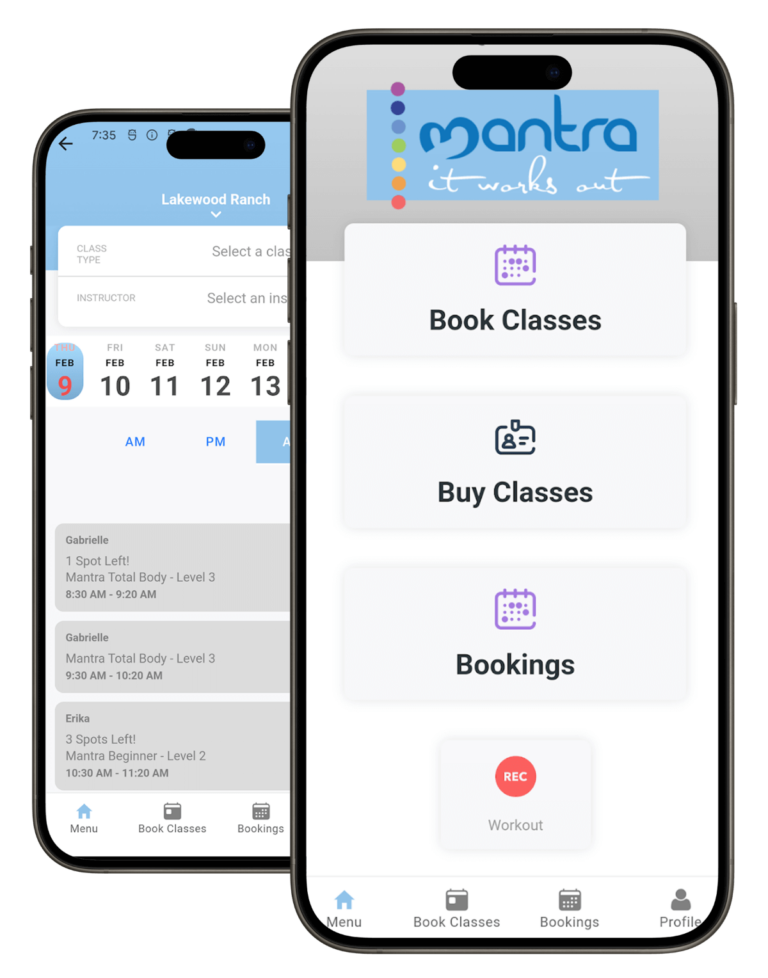 Stay connected with MANTRA by downloading our app from the App Store or Google Play. Simply log in with your MANTRA account information to easily book classes, buy a membership, class packages, or a single class, and view the schedule. Plus, get notified of special challenges and promotions.